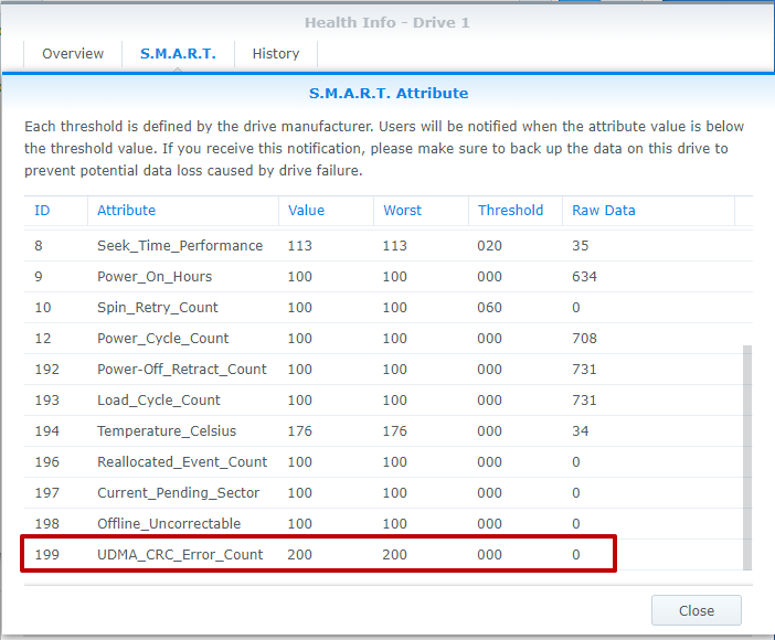 3、檢查硬盤的屬性 ID 199。如果原始數(shù)據(jù)增加,或者如果系統(tǒng)無法識別硬盤,則很可能發(fā)生故障。如果更換硬盤的原始數(shù)據(jù)增加,而可疑故障硬盤的原始數(shù)據(jù)保持為零,則問題與 Synology NAS 有關(guān)。如果在插入上一個插槽時(shí)無法識別更換硬盤,則插槽可能發(fā)生故障。